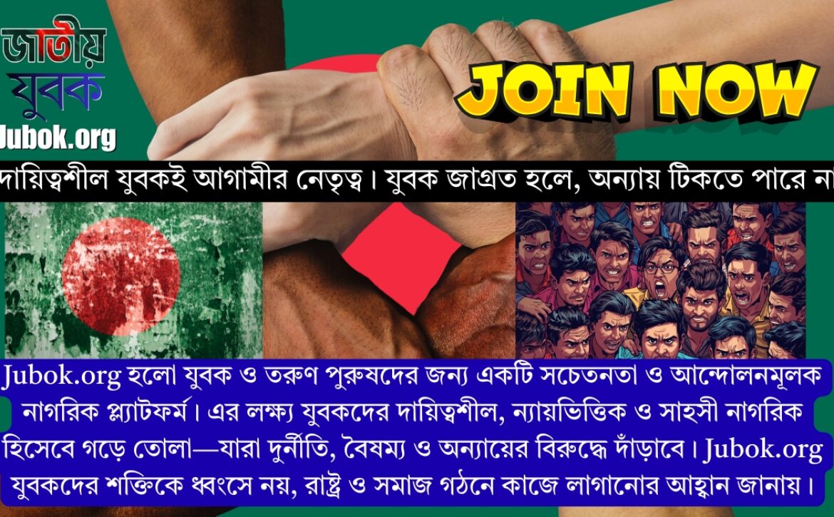 Jubok.org হলো যুবক ও তরুণ পুরুষদের জন্য একটি সচেতনতা ও আন্দোলনমূলক নাগরিক প্ল্যাটফর্ম। এর লক্ষ্য যুবকদের দায়িত্বশীল, ন্যায়ভিত্তিক ও সাহসী নাগরিক হিসেবে গড়ে তোলা—যারা দুর্নীতি, বৈষম্য ও অন্যায়ের বিরুদ্ধে দাঁড়াবে। Jubok.org যুবকদের শক্তিকে ধ্বংসে নয়, রাষ্ট্র ও সমাজ গঠনে কাজে লাগানোর আহ্বান জানায়।